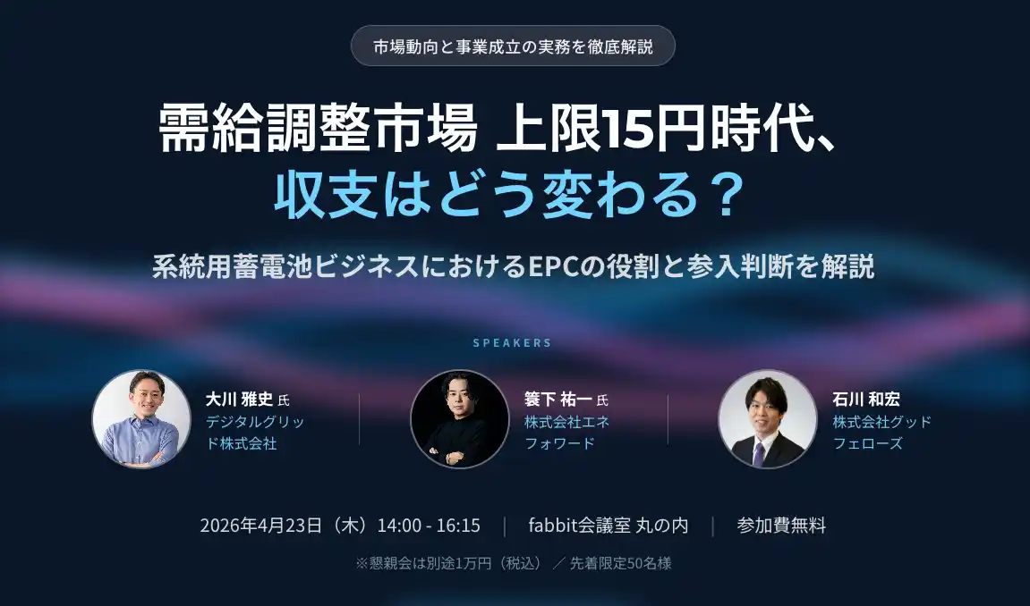 | 株式会社グッドフェローズ(本社:東京都品川区西五反田7-13-5 DK五反田ビル8階、代表取締役:長尾 泰広)は、同社が運営するエネルギー業界の経営者・事業責任者向けクローズドコミュニティ「エナジーCxO」の活動の一環として、系統用蓄電池ビジネスをテーマにした実践型セミナー『需給調整市場 上限15円時代、収支はどう変わる? ― 系統用蓄電池ビジネスにおけるEPCの役割と参入判断を解説』を、2026年4月23日(木)にfabbit会議室 丸の内で開催します。 | |||