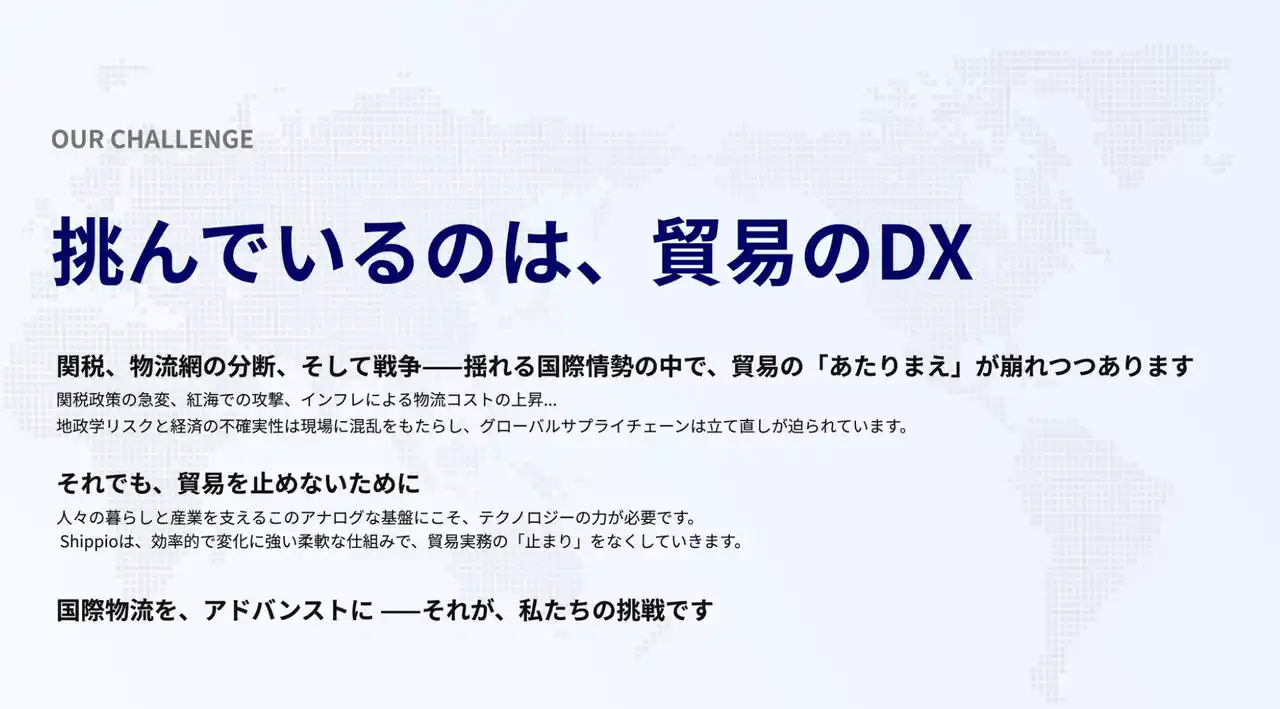Shippioは、半世紀にわたりアナログな実務が続いてきた貿易業界に対し、クラウドとAIを活用したプラットフォームを提供し、単なる業務の効率化にとどまらず「貿易データを経営の武器に」変える支援を行ってまいりました。貿易の状況をリアルタイムで把握・分析することで、物流コストの削減や最適な生産管理、そして販売機会を逃さないための国際物流網の構築を実現します。 |