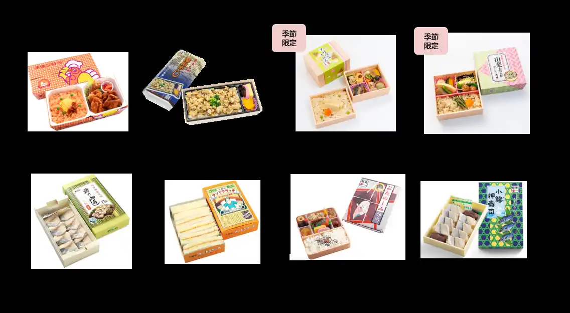 昨年60周年を迎えたロングセラー駅弁「チキン弁当」、明治創業の老舗ブランド“日本ばし大増”の「深川めし」、“湘南鎌倉 大船軒”の「大船軒 鯵の押寿し」、更に株式会社東華軒の「小鯵押寿し」なども取り揃え、簡単・便利・スピーディーにお買い求めいただけます。ぜひ、この機会に足をお運びください。
