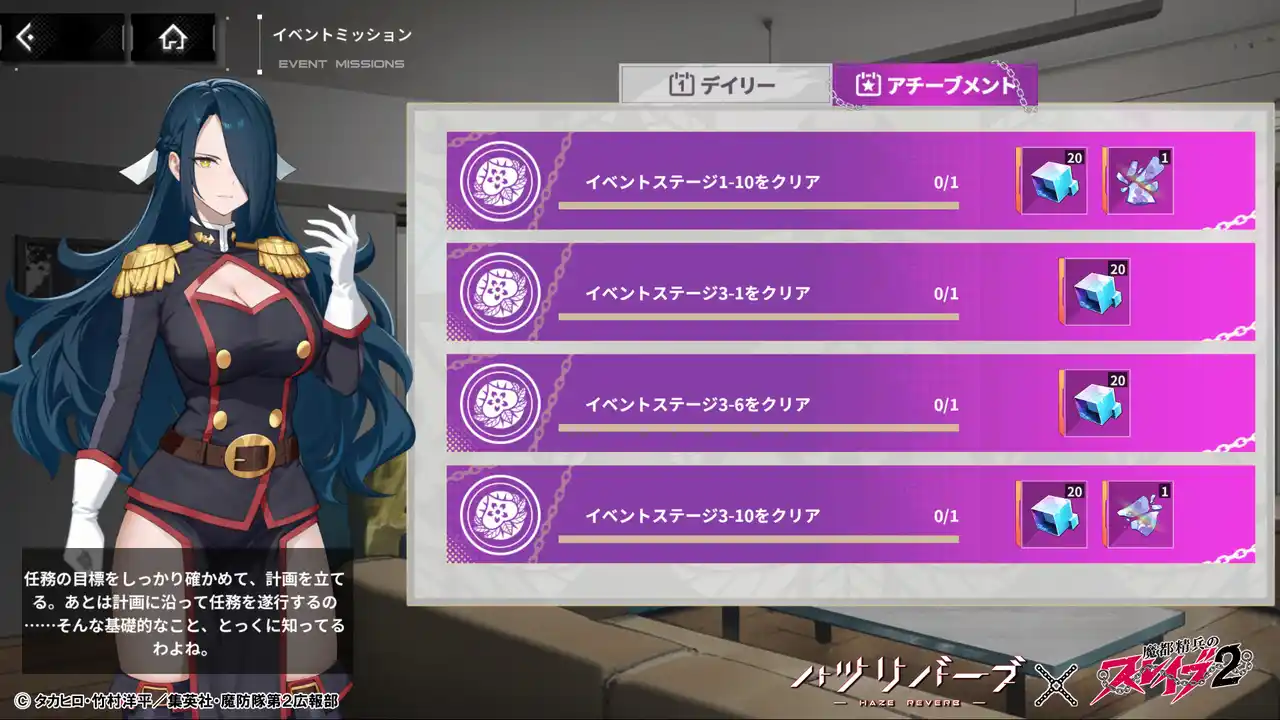 | コラボイベントは残り期間わずか。後編の開放により、今から参加する方でも物語と報酬を一気に楽しめる内容となっております。ぜひこの機会に、『ハツリバーブ』×『魔都精兵のスレイブ2』の世界をご体験ください。 | |||