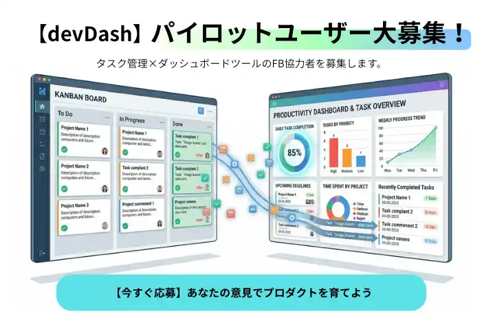 devDashは現在β版を公開中ですが、より実践的なフィードバックをいただくために、実際の業務でdevDashをご利用いただけるパイロットユーザー企業様を募集いたします。 業種・チーム規模は問いません。プロジェクト管理に課題を感じている企業様であれば、どなたでもご応募いただけます。 |