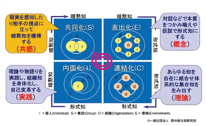 | たとえば製薬企業のエーザイ株式会社は、知識創造理論を経営の実践に応用しました。社長直轄の知創部がリードして、SECI モデルの起点である共同化のための活動に、職種や部署に関わらず、グローバルに全従業員が実務時間の1%を費やしています。 | |||