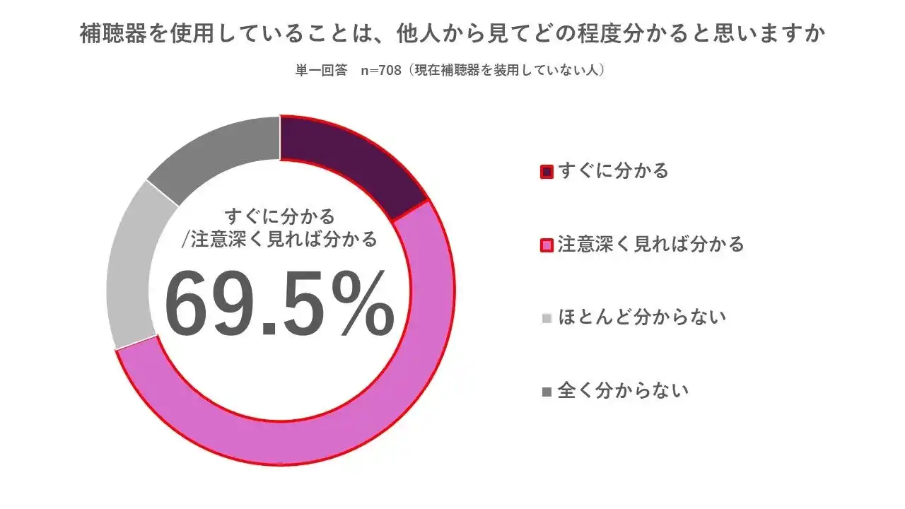 現在補聴器を使用していない人のうち「補聴器を使用していることは他人から分かる」と69.5%が回答。しかし最新の補聴器を装用した写真を見た87.9%が「目立たない」と回答し、イメージと現実のギャップが鮮明に。