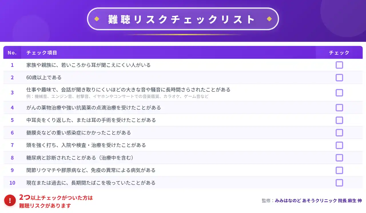 ■「みみはなのど・あそうクリニック」院長の麻生伸先生コメント 今回の調査から、医学的に注視すべき課題が浮き彫りになりました。それは、難聴リスクありと判定された方の約4割が「自分の聴力に不安を感じたことがない」と回答している点です。難聴は進行に気づきにくく、放置すると認知機能の低下を加速させる要因にもなるため、早期対処が不可欠です。 |