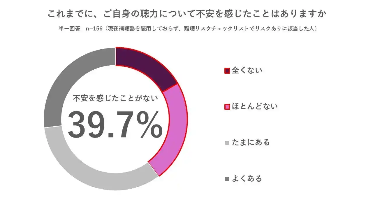 | さらに注目すべきは、リスクありと判定された156名のうち、聴力に不安を感じたことが「ほとんどない」「全くない」と答えた人が39.7%に上った点です。難聴は徐々に進行するため本人が気づきにくく、「自分は大丈夫」と思っていても、実はリスクを抱えている可能性があることが示唆されました。 | ||||||||||||