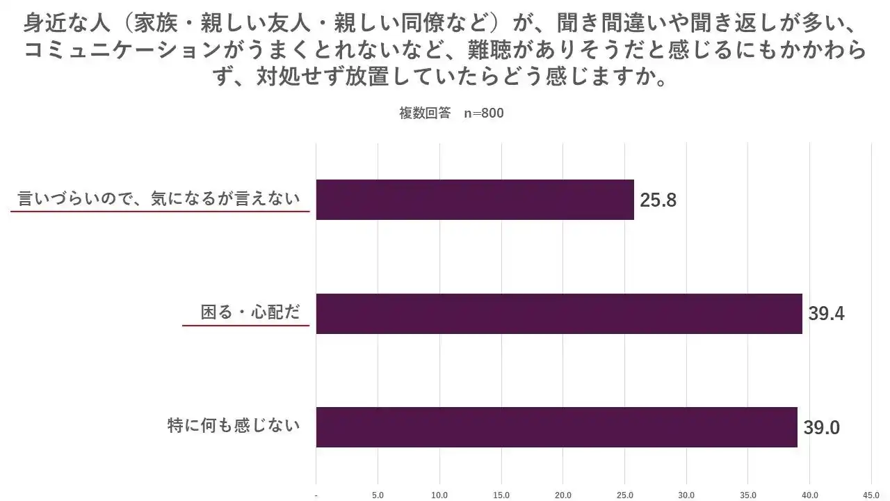 | 一方で、難聴を抱えていそうな身近な人が、対処せず放置していた場合にどう感じるか聞いたところ、「困る・心配だ」または「気になるが言えない」と回答した人は61.0%に上り、身近な人が難聴を放置していることを気にかけている人が多いことがわかりました。 | ||||||||||||