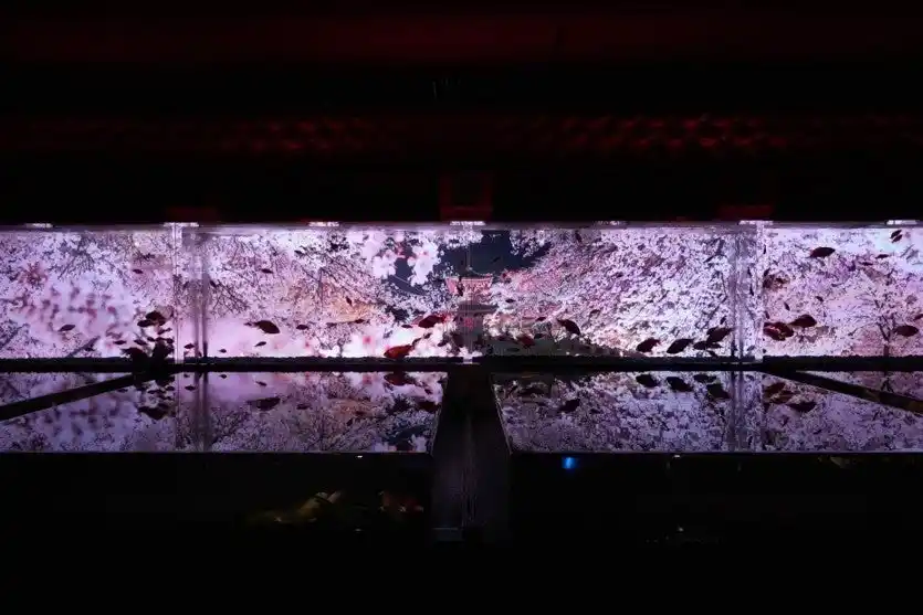 金魚の魚影と水盤に移る四季の景色をお楽しみください。 |