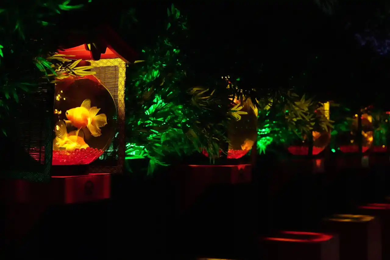アートアクアリウムが表現する提灯のあかりと空間を彩る新緑に包まれる没入体験を。 |