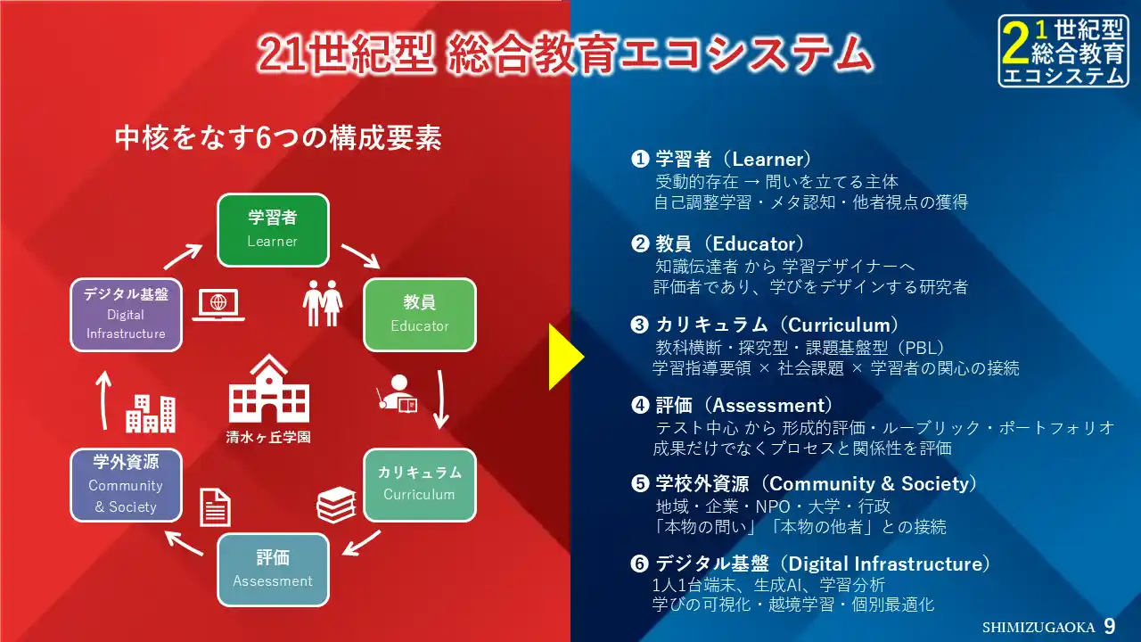 学校を中心に置き、学習者・教職員・地域・起業・NPO・行政・デジタル基盤が相互につながり、知識・スキル・態度・価値を総合的に育成する学習の“生態系”として教育を捉える考え方。 |