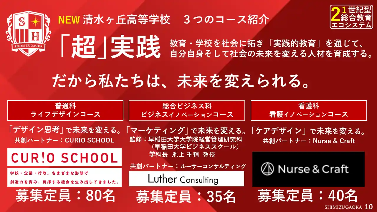 また、清水ヶ丘学園が運営する清水ヶ丘高等学校(校長 林 重憲)についても、石川理事長と小野田校長が中心となり教育内容の刷新をサポート。探究学習や地域・企業・大学との連携を軸とした専門的な学びを深め、未来をデザインするチカラを育成する学校として、大規模な教育改革を進めていきます。 |