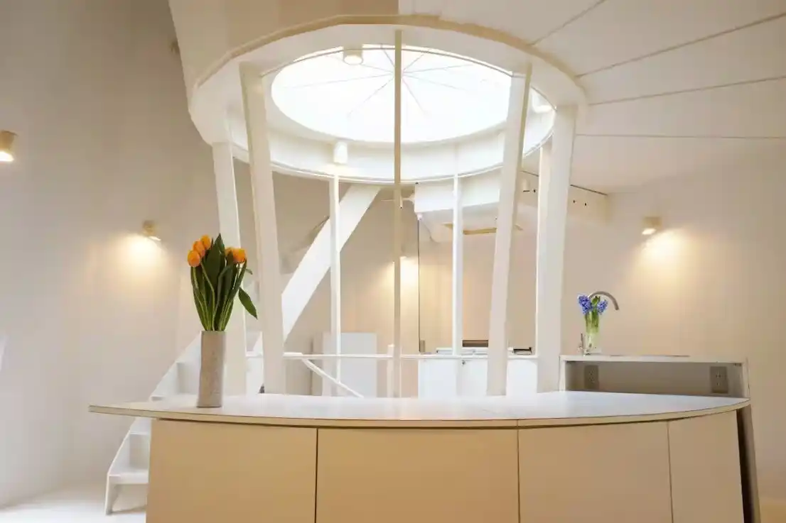 この住宅の核心は、「外部との断絶による究極のプライバシー」にあります。 レーザーカットされた24本の楕円形鉄骨リングが、継ぎ目のないFRP(繊維強化プラスチック)のスキンに包まれ、まるで宇宙船のような滑らかな曲線を形成しています。窓を最小限に抑え、天窓(トップライト)から垂直に降り注ぐ自然光を螺旋階段が受け止める構造は、一歩足を踏み入れた瞬間に都会の喧騒を忘れさせ、住み手を深い瞑想的な静寂へと誘います。 |