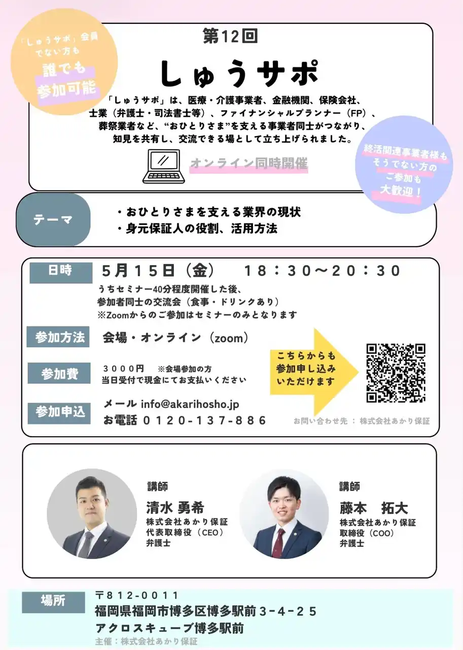 | 弁護士・司法書士・ケアマネジャーなどの専門家と連携し、身元保証サービスを提供する株式会社あかり保証(代表取締役・弁護士:清水勇希、本社:大阪府大阪市)は、おひとりさまを支える事業者コミュニティ「しゅうサポ」の第12回を福岡にて開催いたします。本開催は福岡事務所の開設に伴い、同地域での初開催となり、今後の九州エリアにおける連携強化の第一歩と位置付けております。 | ||||||
