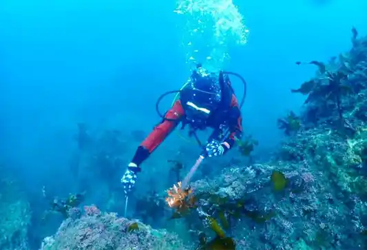 全国的な海の課題となっている、藻場が喪失する「磯焼け」の対策として、横須賀市では、漁業協同組合と協力し、長井沖で藻場の造成活動を行っています。