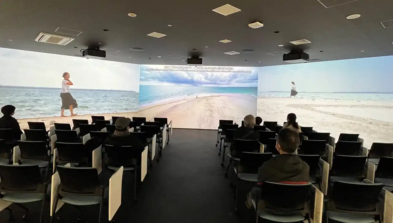 ゲートウェイホールには3面の「白い壁」があり、講演会やウェビナーで資料を投影したりオンライン参加者の姿を映したり多目的に活用可能です。特に、この「白い壁」は迫力ある没入型スクリーンとしても活用でき、昨年11月のオープン以来、「日本 ~海・大地・気候がもたらす様々な風土」と「日本海・竹島のアシカ猟」という2つの動画を一日数回ずつ上映してきました。 |