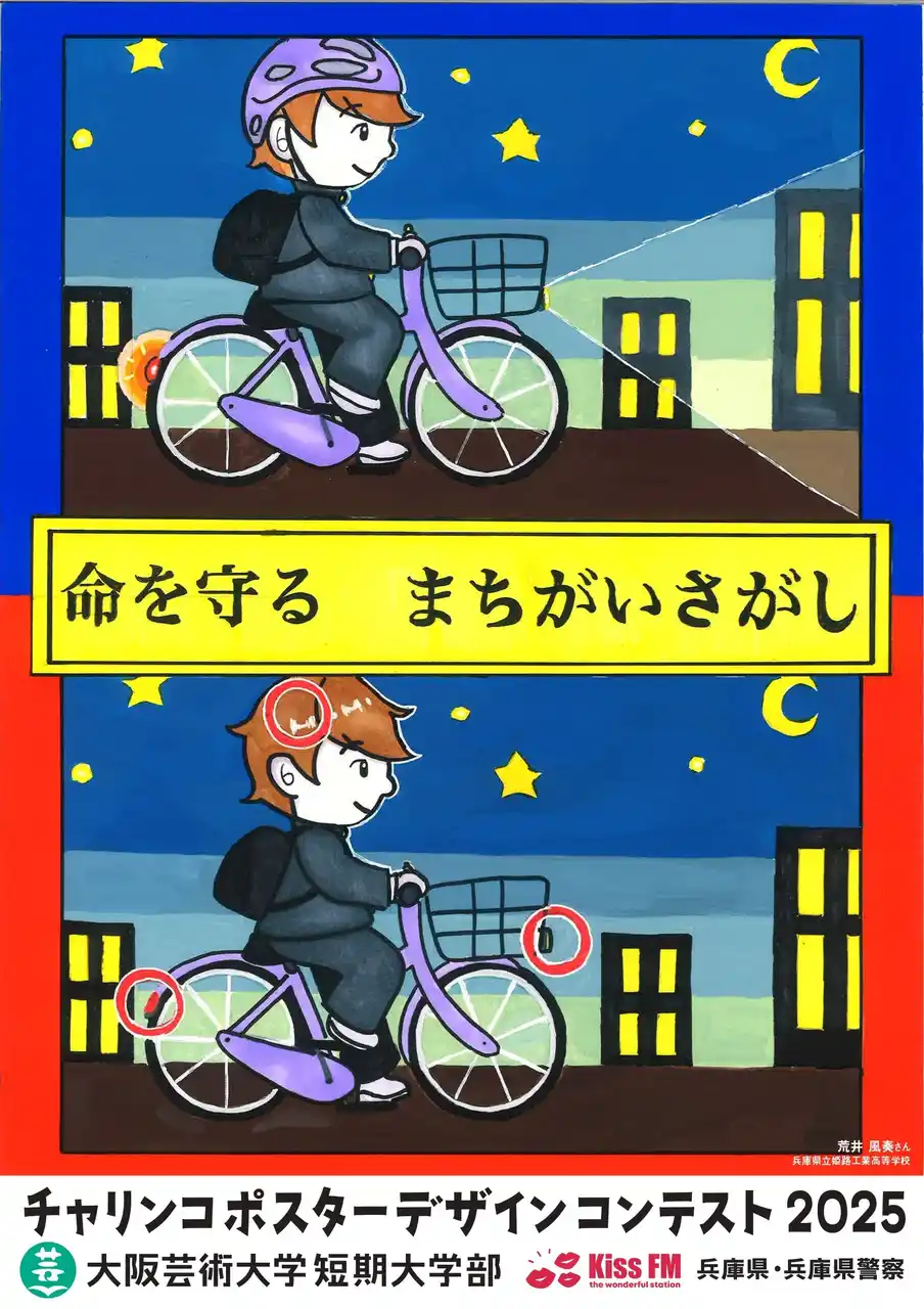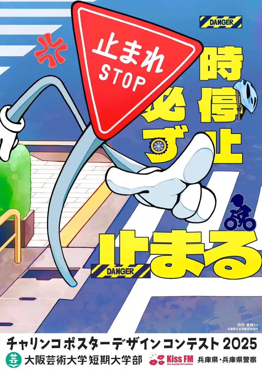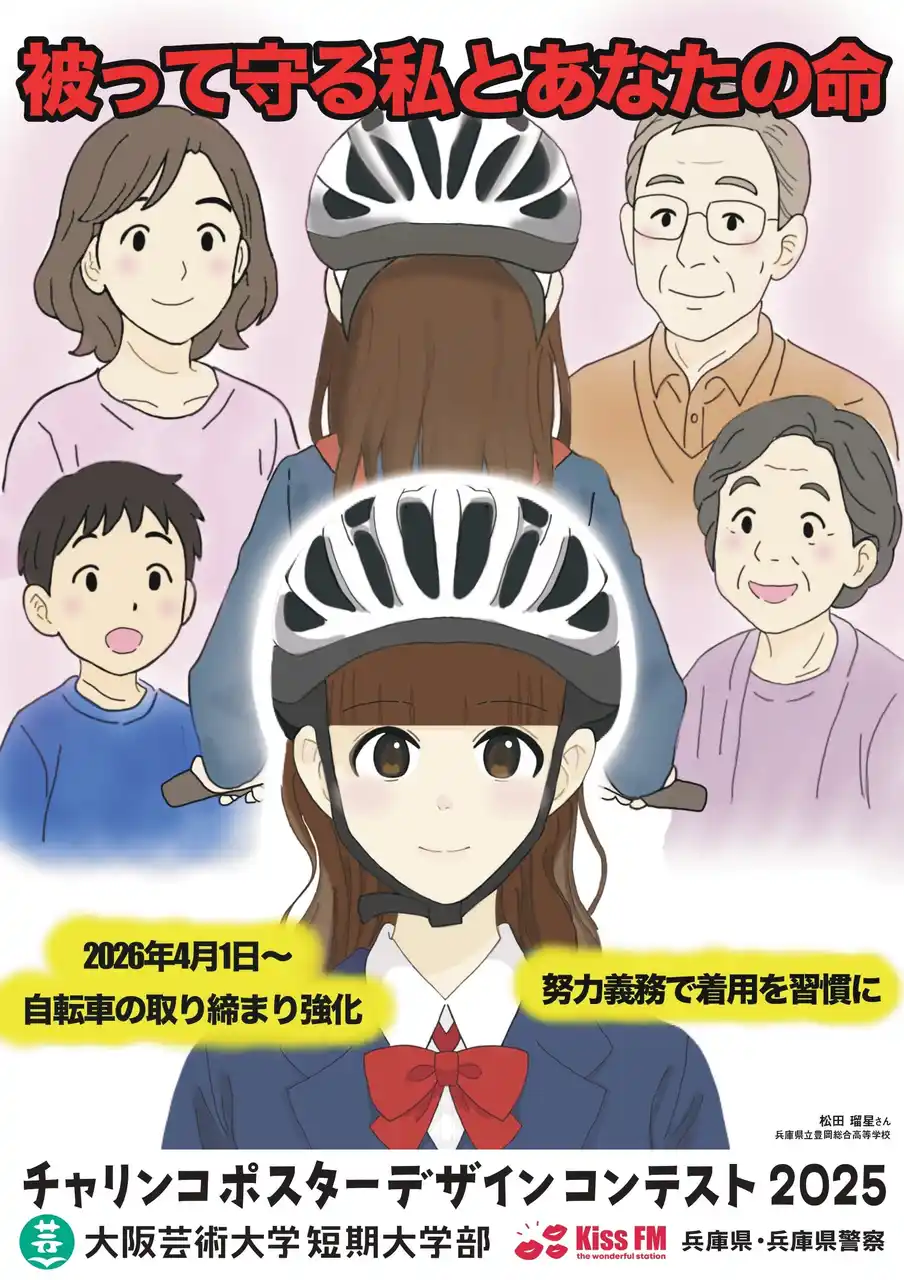 大阪芸術大学短期大学部(所在地:兵庫県伊丹市/学長:塚本 英邦)はKiss FM KOBE と共同で、兵庫県および兵庫県警察の後援のもと、高校生を対象とした「チャリンコポスター デザインコンテスト2025」の表彰式を2026年3月7日に開催しました。通算9回目を迎える本事業は、高校生の柔軟なアイデアを実際の交通安全啓蒙に活用する産学官連携の社会実装プロジェクトとして展開しています。 |