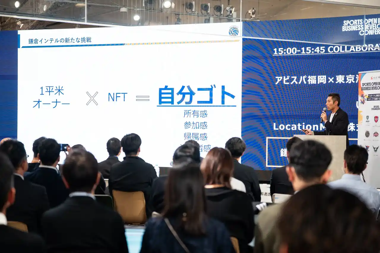 | 当日はオーナー室室長 勝碕俊行が登壇し、「鎌倉スタジアムNFTプロジェクト」に関する報告を実施。スポーツ庁長官の河合純一氏をはじめ、全国から400名以上(スポーツ共創プレイヤー・来場者)が一堂に集結するなか、スポーツを起点とした「スポーツ×他産業」による新たな価値創造に挑戦する取り組みとしてプレゼンを行いました。 | ||||||||||||||
