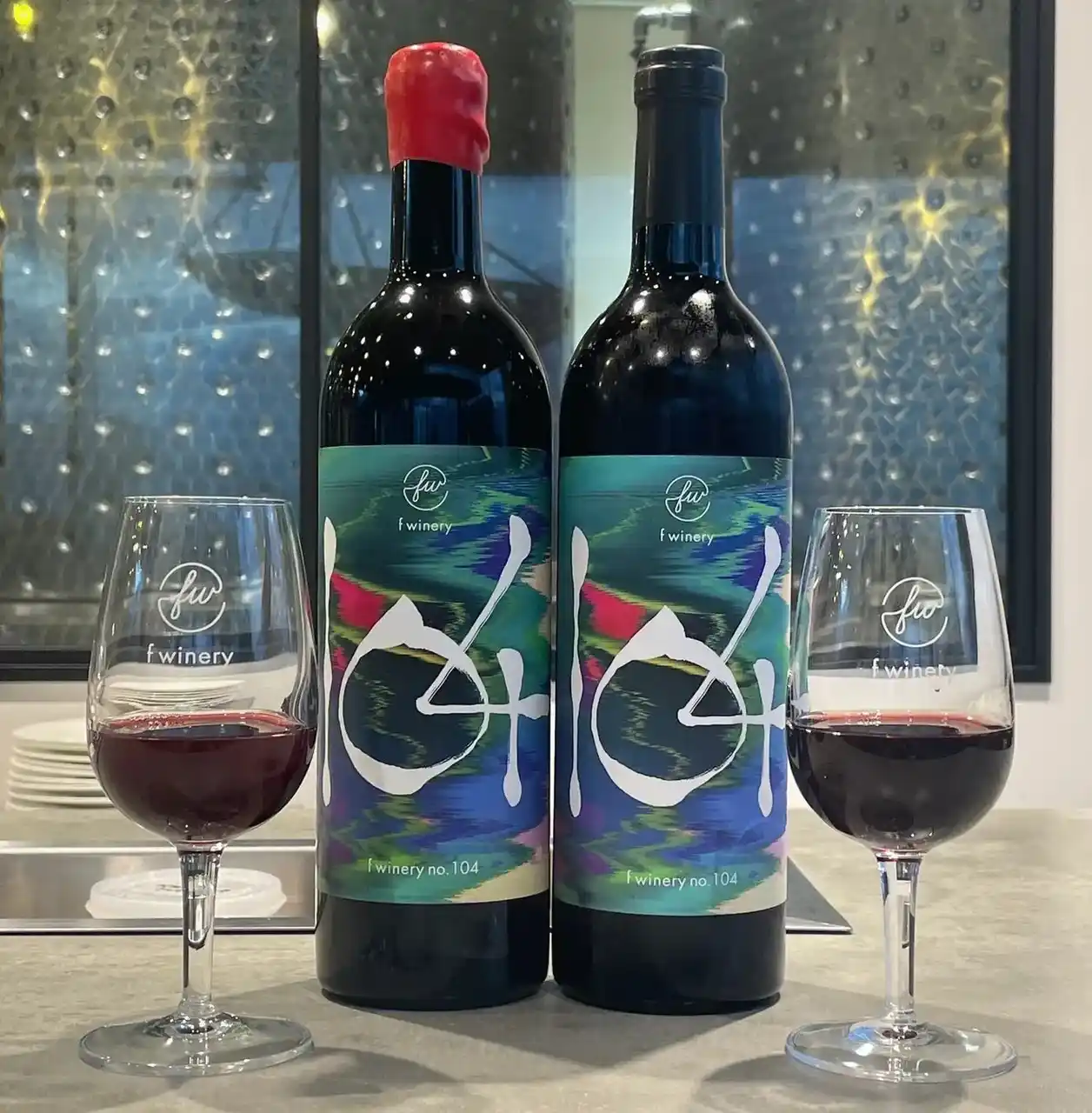 no.104」のグラスワイン通常¥1,100(税込み)を特別価格¥500(税込み)で、ボトル(750ml)通常¥13,200(税込み)を特別価格¥10,560(税込み)で、f wineryのカフェ&バー・スタンドエリアで販売します。海底熟成をしていない同じ醸造ワイン「【NEW】f winery no.103」と「f winery no.104」のグラスワイン¥700(税込み)、ボトル(750ml)¥3,520(税込み)も数量限定で販売します。 |