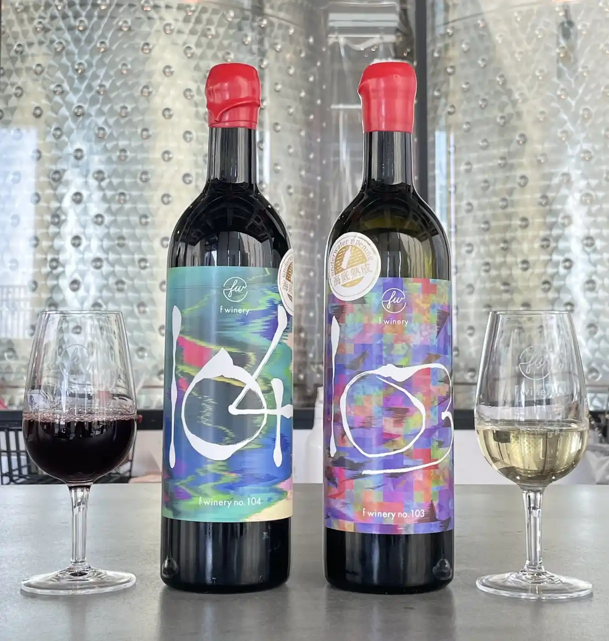 写真左:【数量限定】海底熟成ワインf winery no.104、写真右:【NEW・数量限定】海底熟成ワインf winery no.103 |