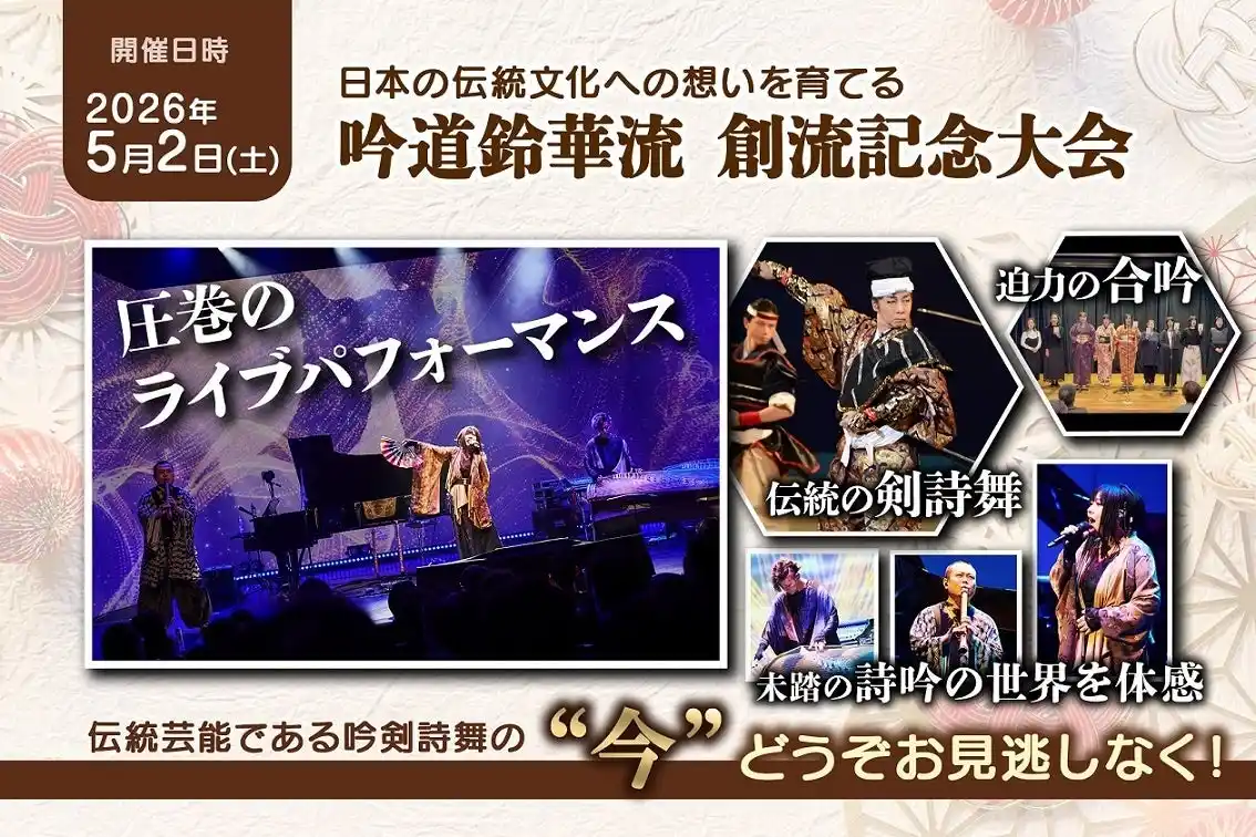 ■「吟道鈴華流 創流記念大会」 開催概要 鈴華ゆう子(宗家 鈴華慶晟)は、5歳から詩吟と剣詩舞を始め、全国大会での優勝経験も持ちます。しかし、吟剣詩舞は「知る人ぞ知る存在」であり、一般の方には届きにくい現状がありました。 そこで、伝統を「難解で敷居が高い」として閉じ込めるのではなく、誰もが楽しめる「エンターテインメント」として次世代へ繋ぐ場が必要です。吟剣詩舞を「まずは一人でも多くの方に生で観てほしい」という思いから、あえて「抽選による無料席枠」を設けるなど、入り口を広げる挑戦を行っています。 ● 日時: 2026年5月2日(土)開場13:00 / 開演13:30 ● 場所: 調布市文化会館たづくり(2階) くすのきホール ● 主なプログラム: 鈴華流門下生による吟詠、他流派による吟剣詩舞、友好出演パフォーマンス、構成演舞「吟剣詩舞×ライブパフォーマンス」 ● 出演予定者: 吟道鈴華流 宗家 鈴華慶晟(鈴華ゆう子)、日本壮心流(宗家 入倉昭星 他)、箏 いぶくろ聖志、尺八 神永大輔、津軽三味線 匹田大智、篠笛・能管 迎田優香、書家 美帆 ほか ● 大会詳細→https://yuko-suzuhana.com/suzuhanaryu/ |