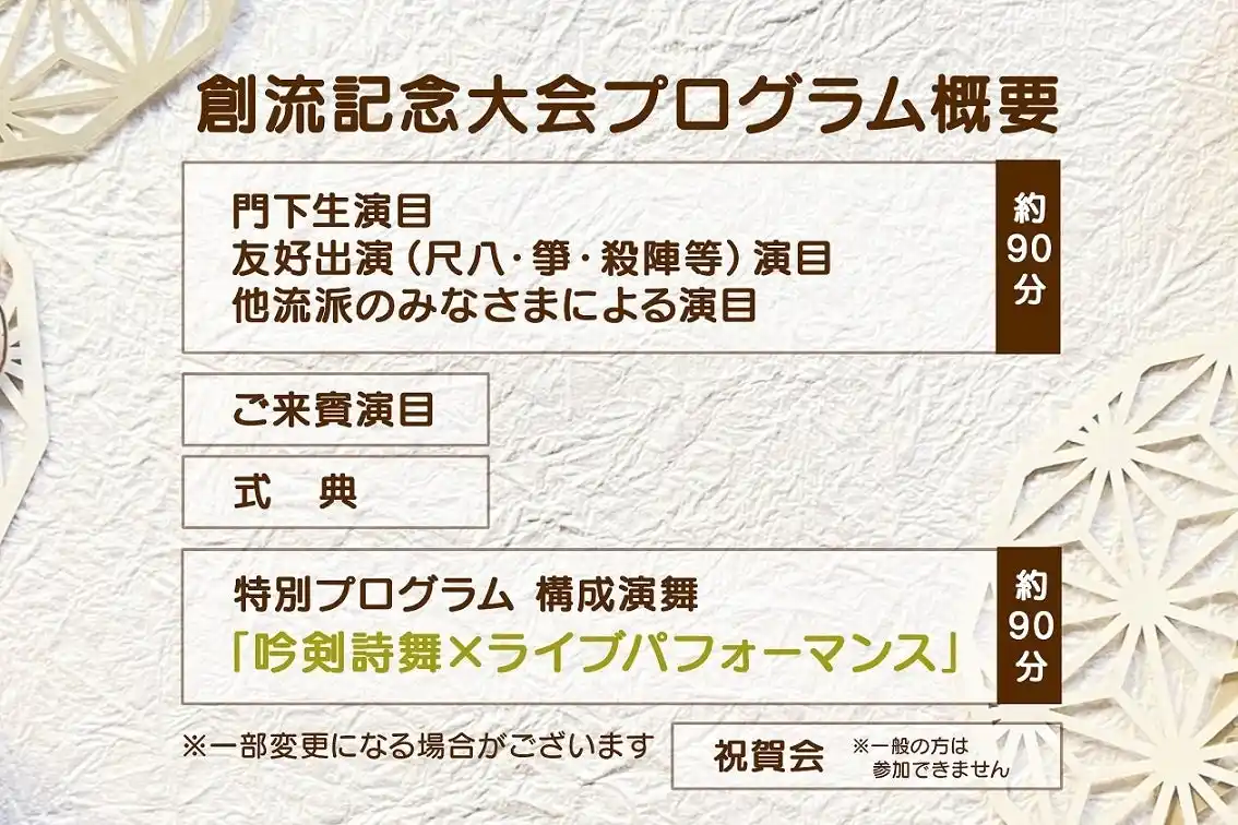 クラウドファンディングを通じた挑戦 無料席を設ける一方で、質の高い舞台づくりや門下生の育成を続けるためには資金が必要です。そこで、「吟剣詩舞を、より身近なエンタメへ。誰もが楽しめる新流派の大会を成功させたい!」と題したクラウドファンディングが、プラットフォーム「CAMPFIRE」にてスタートしました。 支援者には、会場に行けなくても想いを届ける「自宅から応援コース」と、最前線で幕開けを見届ける「参加して応援コース(優先的な座席確保など)」の2つの形をご用意しています。 ■ クラウドファンディング概要 ● プラットフォーム: CAMPFIRE ● 募集期間: 20263年3月28日12:00~年4月30日 23:59まで ● 主なリターン(返礼品): o 【自宅から応援】 デジタルお礼状、限定グッズ(手ぬぐい、ステッカー、クリアファイル等)、エンドロールクレジット掲載、定点カメラ映像データ など o 【参加して応援】 一般抽選に先駆けた観覧席の確約、宗家との2ショット撮影を含むホテル祝賀会へのご招待 など 支援ページ→ https://camp-fire.jp/projects/928140/view |