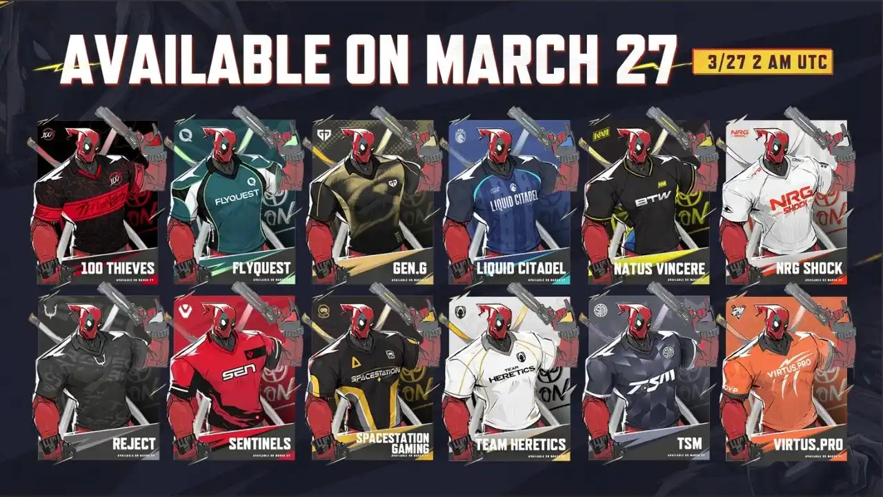 REJECT Team Bundleには、デッドプールのREJECT特別スキン(ユニフォーム着用、胸・背中にREJECTロゴ入り)をはじめ、REJECTマスコットキャラクター「じぇじぇ」のスプレー、Mood、絵文字などが含まれます。 |