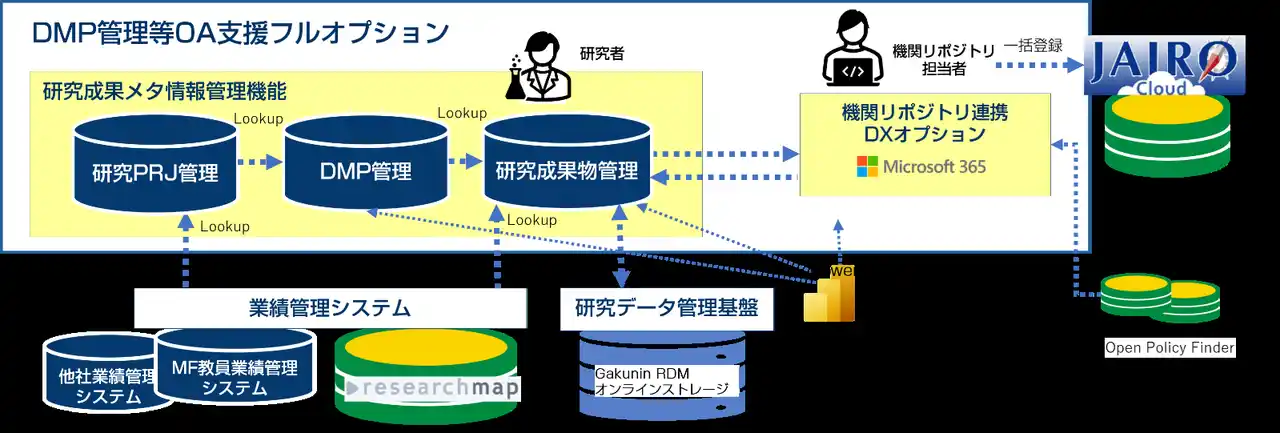 概要:MF教員業績管理システムにDMP管理機能と機関リポジトリ連携機能を付加するオプション機能 |