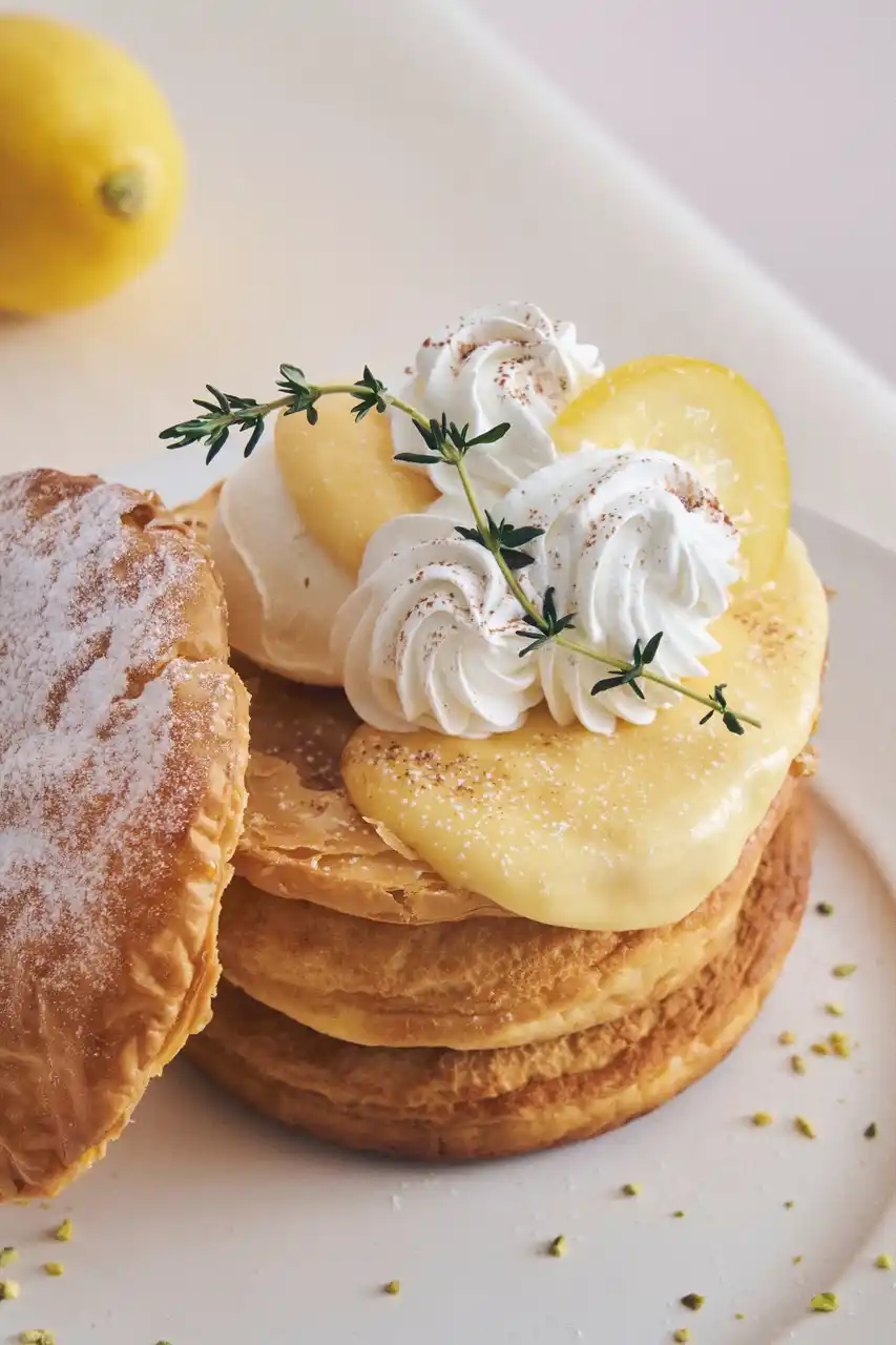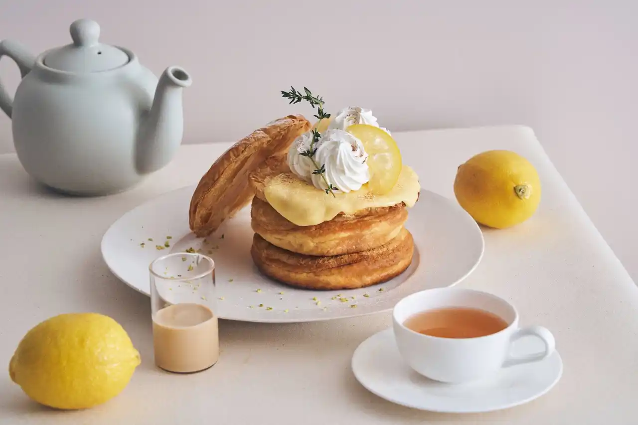 | サクッと軽やかなパイと、ふわもち食感のパンケーキのコントラストが心地よく、さわやかな酸味が広がります。仕上げは、ダージリンが香るカスタードソース。紅茶のまろやかなコクがレモンの酸味をやさしく引き立て、軽やかで上品な味わいのひと皿に。 | |||||||||||||