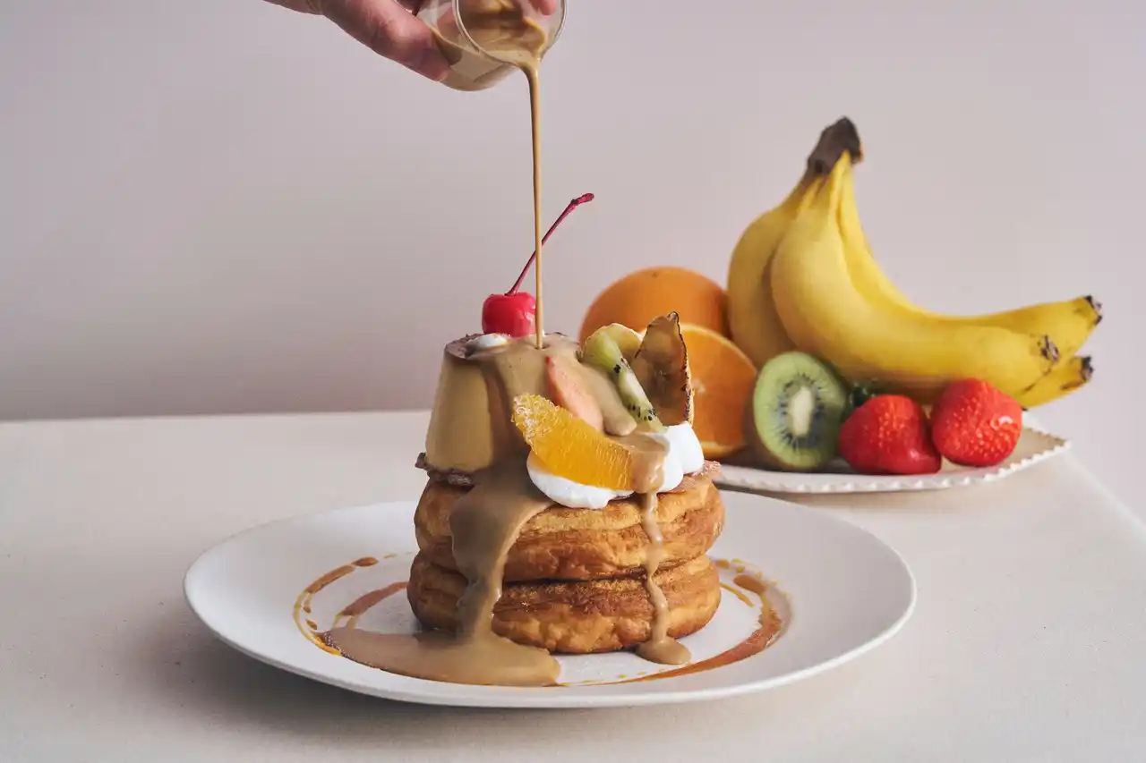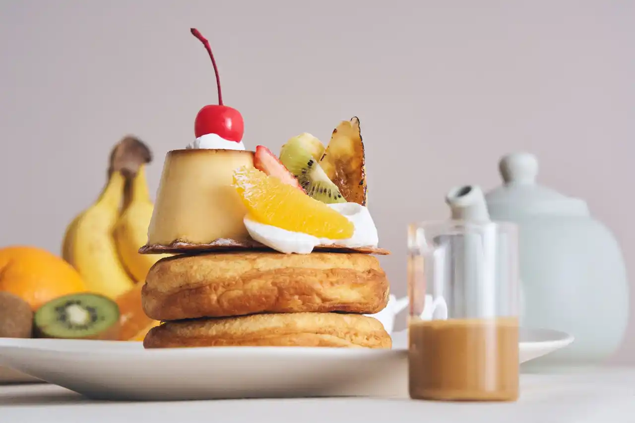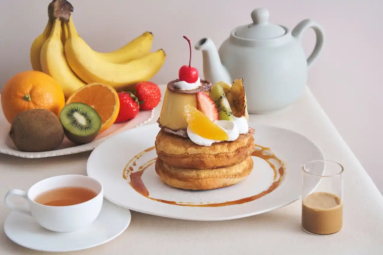 | ◆ “固めプリン” × 果実 × 黒糖ミルクティーの「プリンアラモードパンケーキ」 | |||||||||||||