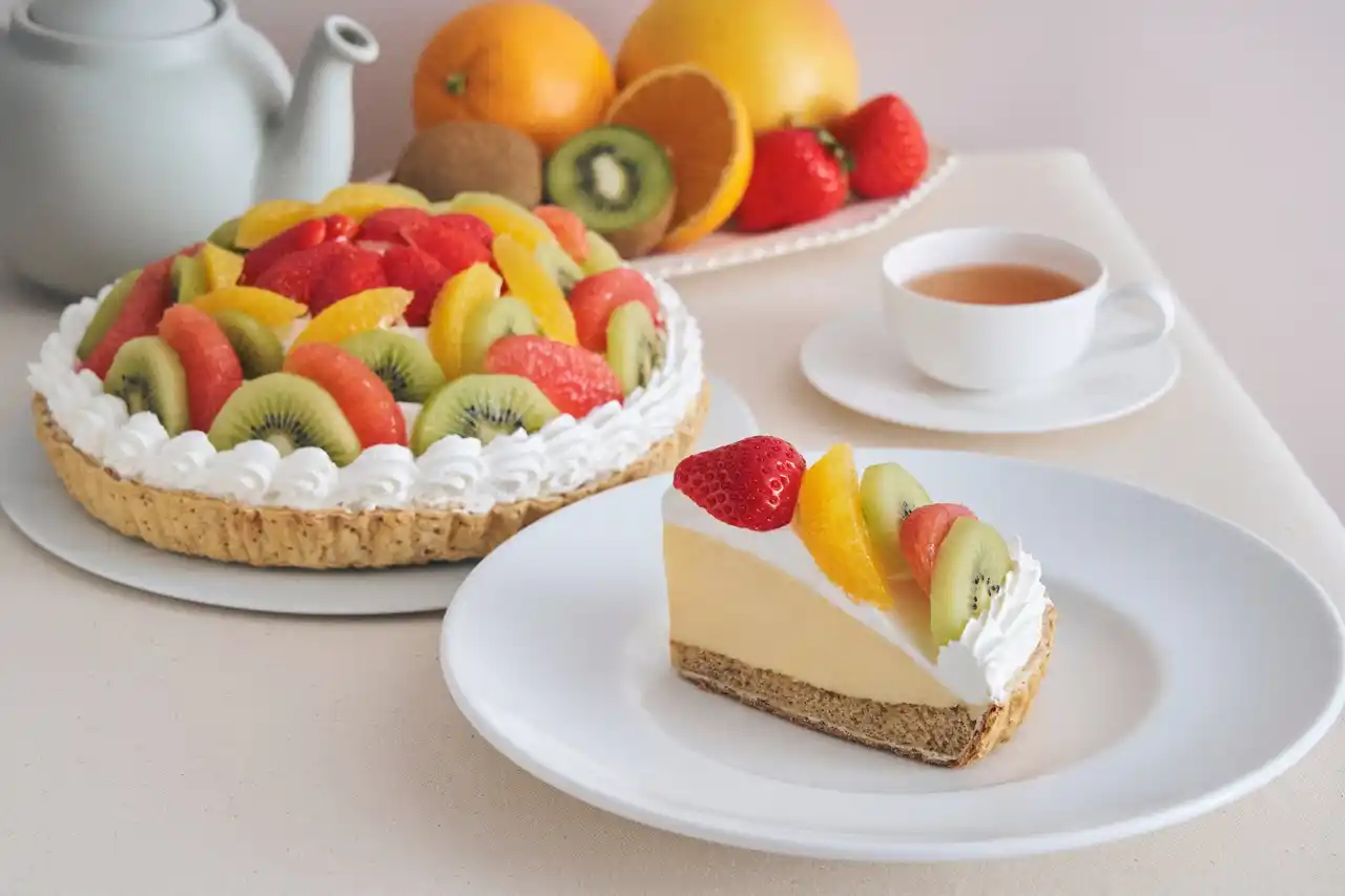 | サクッとしたパイの上には、香り豊かな紅茶のスポンジ。ほんのりと染み込ませたティーシロップを隠し味に、いちご、キウイ、オレンジ、ピンクグレープフルーツをたっぷりとのせた彩り豊かなフルーツケーキパイです。みずみずしい果実の甘みと酸味が口いっぱいに広がり、そのおいしさを引き立てるのは、まっすぐな味わいのカスタード。やさしい甘さがそれぞれのフルーツと重なり合い、最後のひと口まで飽きのこない仕上がりに。果実の魅力を存分に楽しめる、満足感のあるひと皿です。 | |||||||||||||
