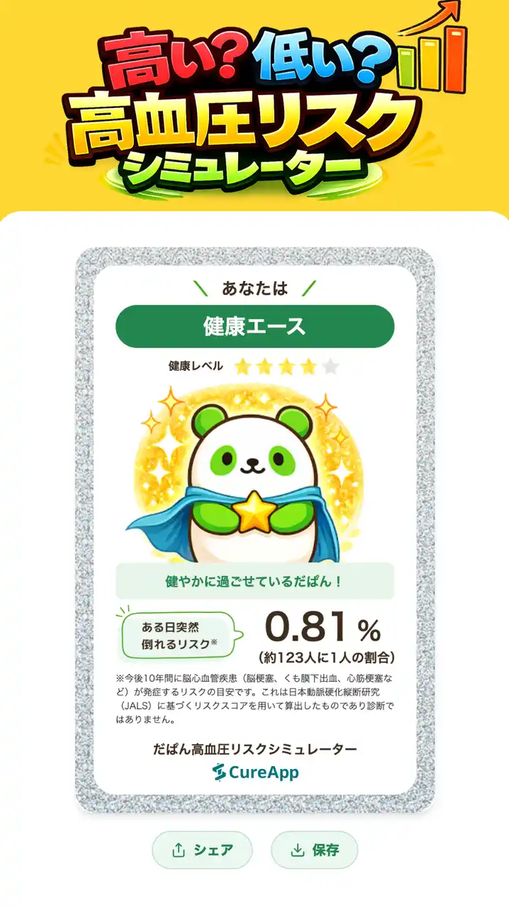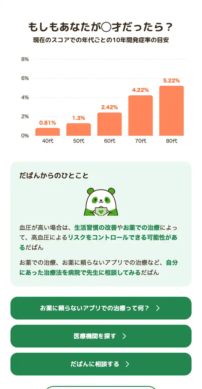 株式会社CureApp(キュア・アップ / 本社:東京都中央区 代表取締役社長:佐竹 晃太以下、当社)は、高血圧お役立ちLINE「だぱん」に、現在の血圧や年齢、生活習慣などから将来の脳心血管疾患のリスク目安を表示する新コンテンツを追加しました。10年間で脳心血管疾患で突然倒れるリスクをパーセンテージで表示し、生活改善や高血圧治療への動機づけを行います。登録・利用は無料です。 |