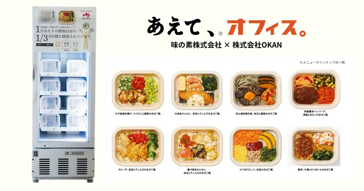 本協業では、OKANが置き型社食(R)︎「オフィスおかん」を通じて蓄積してきた、働く現場における人材定着の知見やサービス提供の仕組みと、味の素グループが創業以来培ってきた「おいしく食べて健康づくり」を体現する高度な冷凍食品開発技術を融合。人手不足に直面する企業の職場環境に求められる多様なニーズに応えるべく、一食完結型の置き型社食(R)︎「あえて、(R)︎ オフィス。」を共同開発いたしました。2026年5月1日(金)より提供を開始します。 |