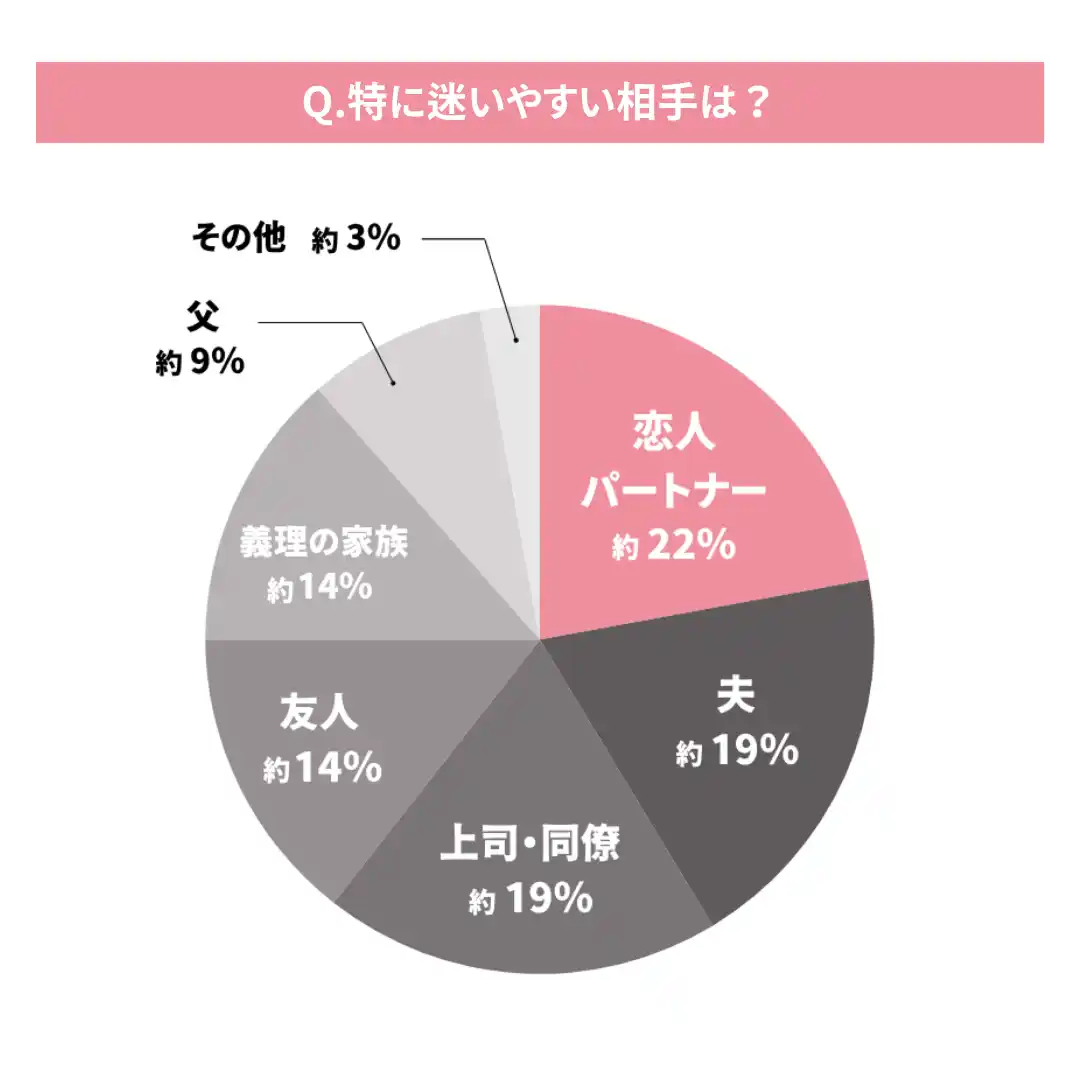 回答者に「特に迷いやすい相手は?」と質問したところ、最も多かったのは「恋人/パートナー」(約22%)で、「夫」「職場の上司・同僚」(ともに約19%)が続きました。 |