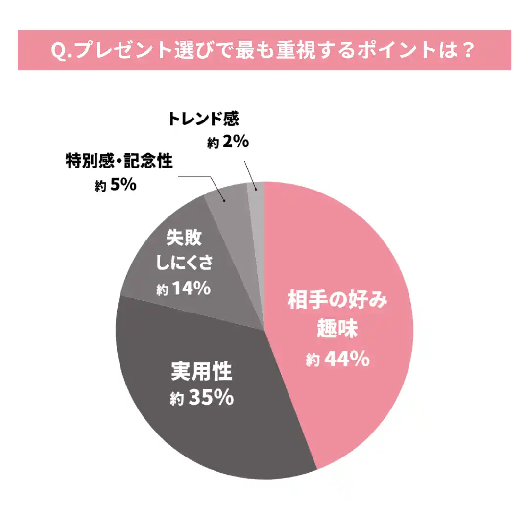 回答者に、「最終的にプレゼントを選ぶとき、最も重視するポイントは?」と質問したところ、「相手の好み・趣味」(約44%)が最も多く、次いで「実用性」(約35%)という結果になりました。 |