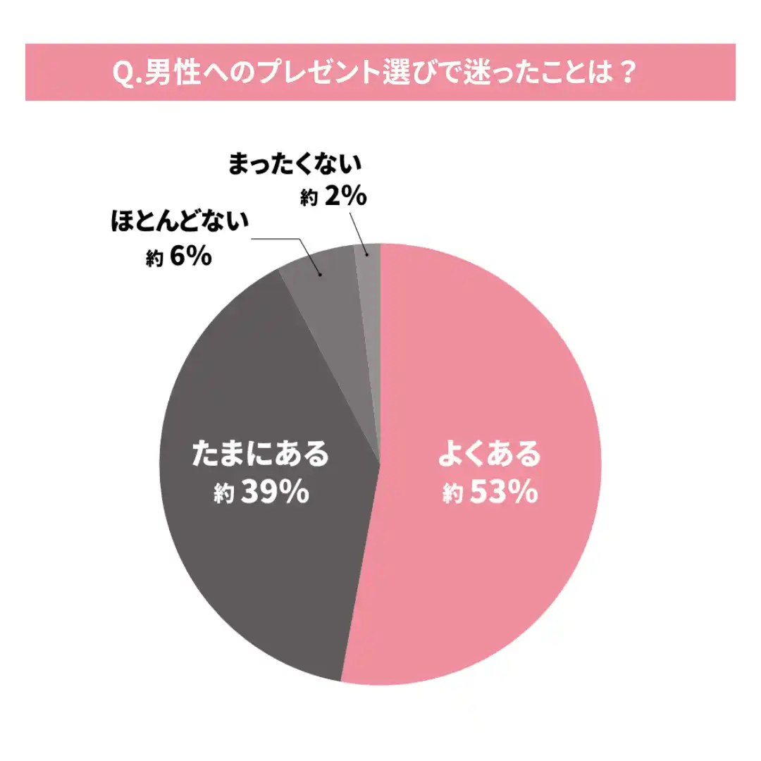 回答者に「男性へのプレゼント選びで、迷ったことはありますか?」を質問したところ、「よくある」(約53%)、「たまにある」(約39%)を合わせると、実に約92%がプレゼント選びに迷った経験があると回答しました。男性向けギフト選びは、多くの人にとって“悩みやすいテーマ”であることが明らかになりました。 |