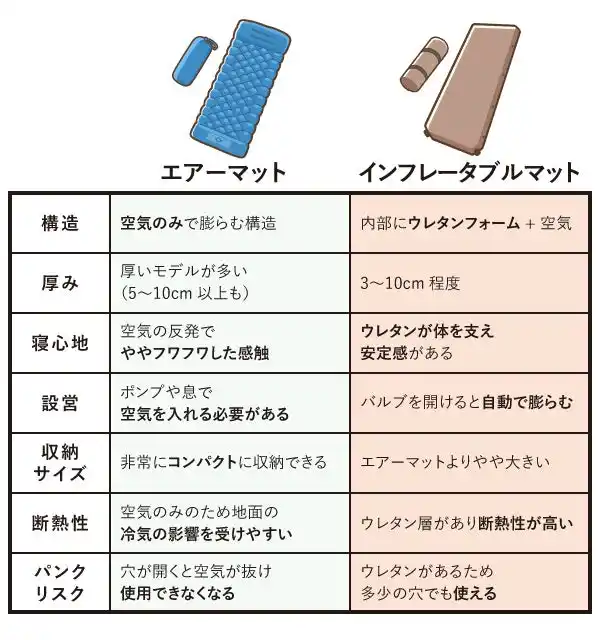 | キャンプマットは厚さで比較されることが多い一方で、寝心地に影響する要素の一つが「構造」です。 | |||||||||