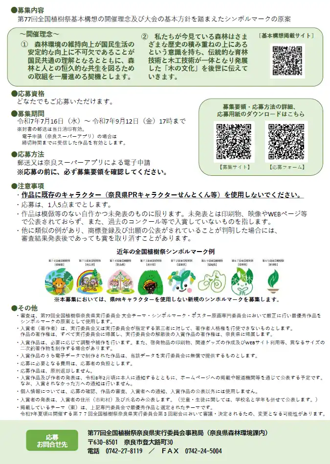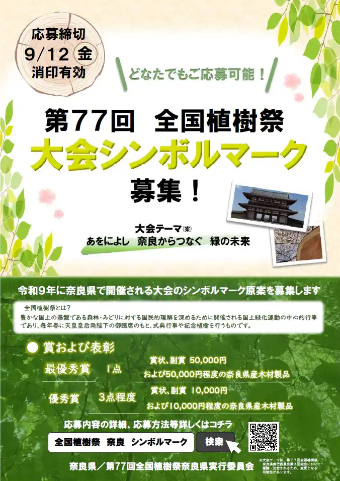 | 令和9年春季に奈良県で開催の「第77回全国植樹祭」を広く周知し、開催機運を高めるため、第77回全国植樹祭の大会テーマや、基本構想の開催理念、大会の基本方針を踏まえたシンボルマークを募集します。 |
