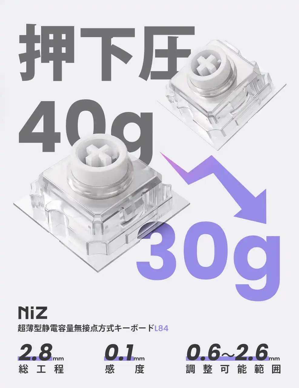 今作ではNIZ従来モデルより更に軽くすべく、専用スイッチを開発して押下圧30gfを実現。 |