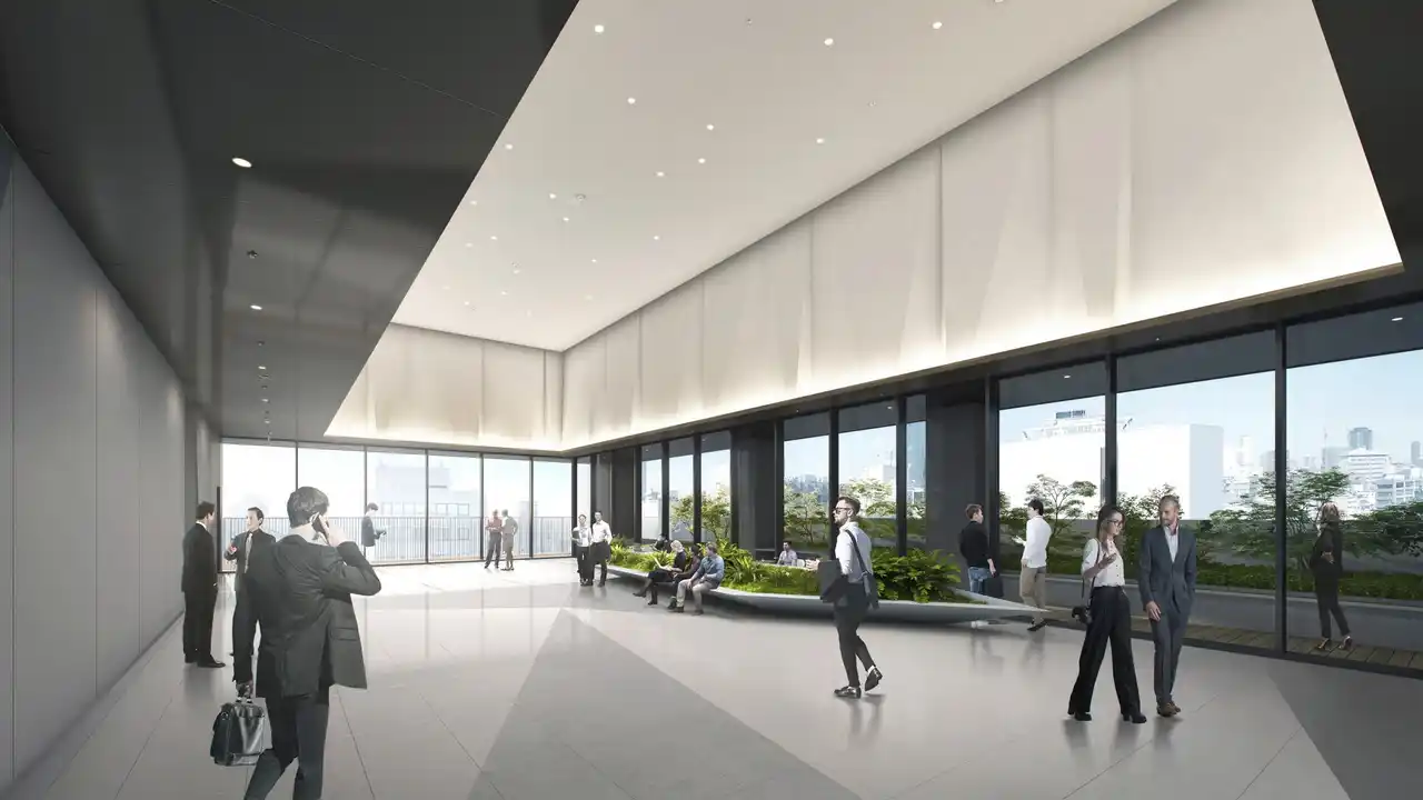 8階のオフィスロビーは2層吹き抜けの開放的な空間として計画するとともに、御堂筋を望む屋外テラスと接続し、オフィスワーカーや来街者にゆとりとくつろぎを与える空間を提供します。 |