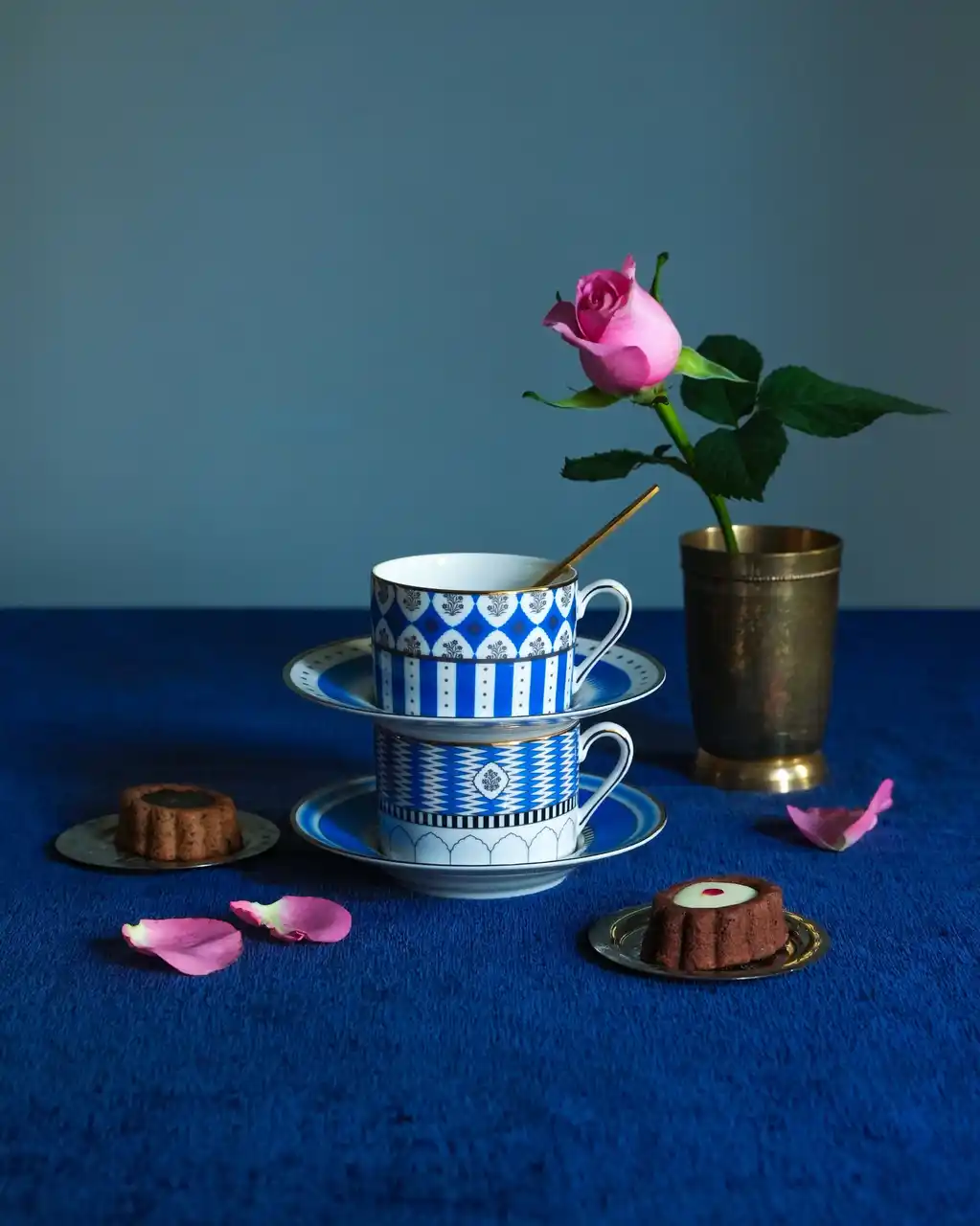 「伝統の美をモダンに融合し、日常に溶け込む心地よさ」をテーマに、インド建築やテキスタイルなどを現代に馴染むデザインに再構築されており、ブランドを象徴するブルーの色彩を軸に、2種のデザインを展開。異なるブルーを基調に、ゴールドのアクセントを重ねることで、上品さと華やかさの両立を実現いたしました。 |
