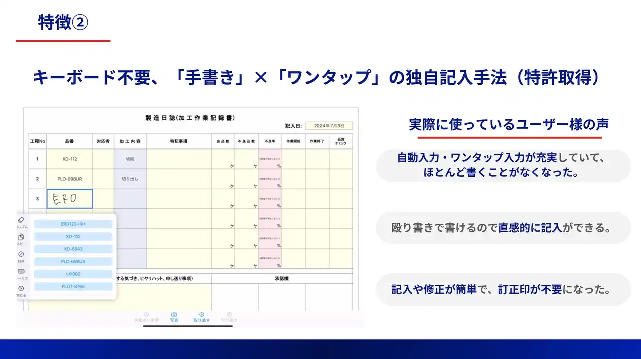 タブレット操作に不慣れな方でも気軽に入力でき、これまで紙の帳票に手書きしていた操作感をそのまま再現しています。 |