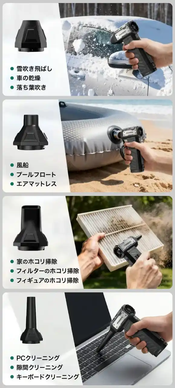 ・弱モード:精密機器やデリケートなパーツに。ホコリを優しく吹き飛ばしたい場面で活躍します。 |