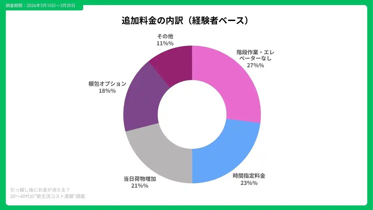本調査から、引っ越し費用の本当の負担は「見積り額」ではなく、その後に続く“コスト連鎖”にあることが明らかになりました。 特に、追加料金・新生活初期支出・固定費のスリップが重なることで、30日間で10万円以上の想定外支出が発生するケースも多いようです。 |
