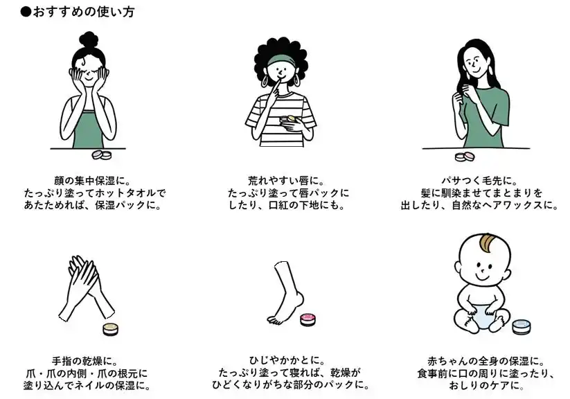 体温ですっと溶けて少量でも伸びがよいため、心地よくお使いいただけます。かさついた顔、唇、髪の毛先、手肌、爪、ひじ、かかとなど、乾燥が気になる部分を集中ケアします。 |