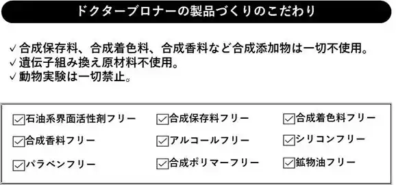 ドクターブロナーは、1948年の創業以来、全ての製品がオーガニックであることに、こだわりを持ち続けています。成分のほとんどが無農薬有機栽培で育てられた植物で、独自の厳しいガイドラインを定めたフェアトレードプロジェクトを通じて調達しています。私たちの肌にはもちろん、地球にも環境にもやさしい製品づくりをしています。 |