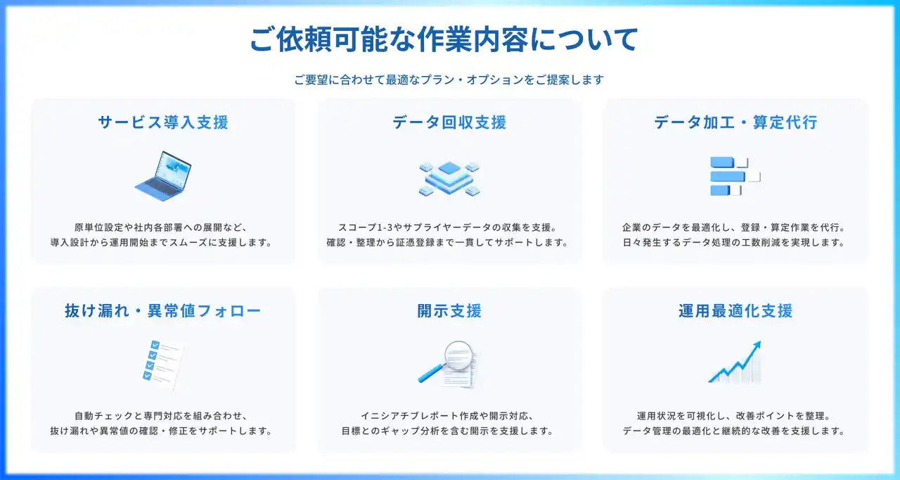 企業が保有する各種データを整理し、CO2排出量の登録や算定作業を代行します。 |