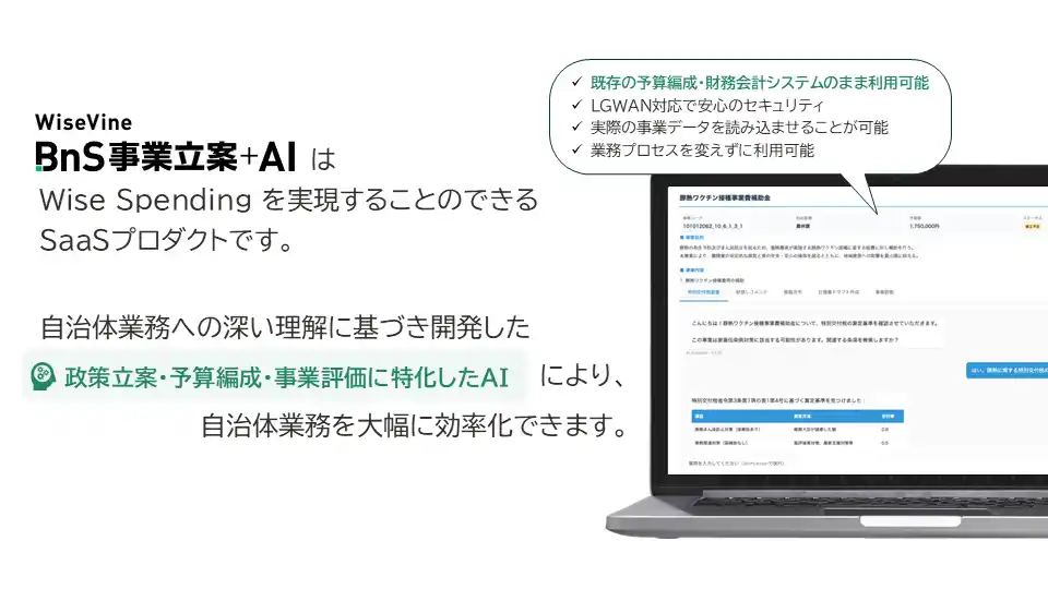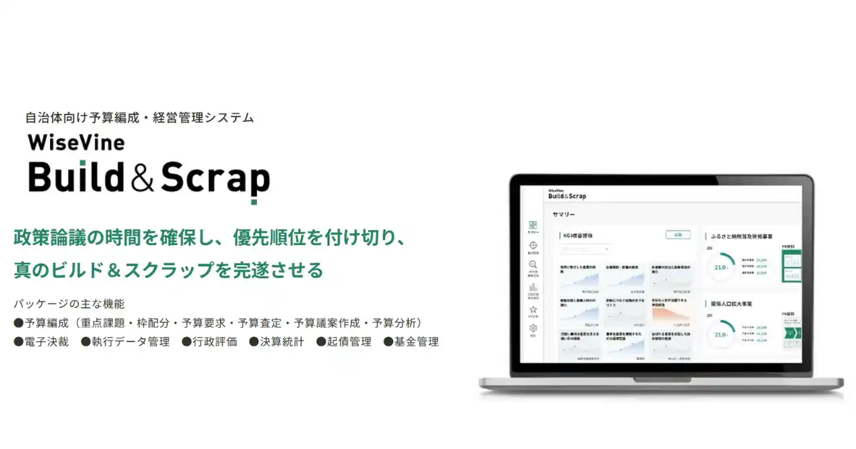 事業内容:自治体向け予算編成・経営管理システム「WiseVine Build & Scrap」、事業立案サポートAI「WiseVine BnS事業立案+AI」の開発・提供 など |