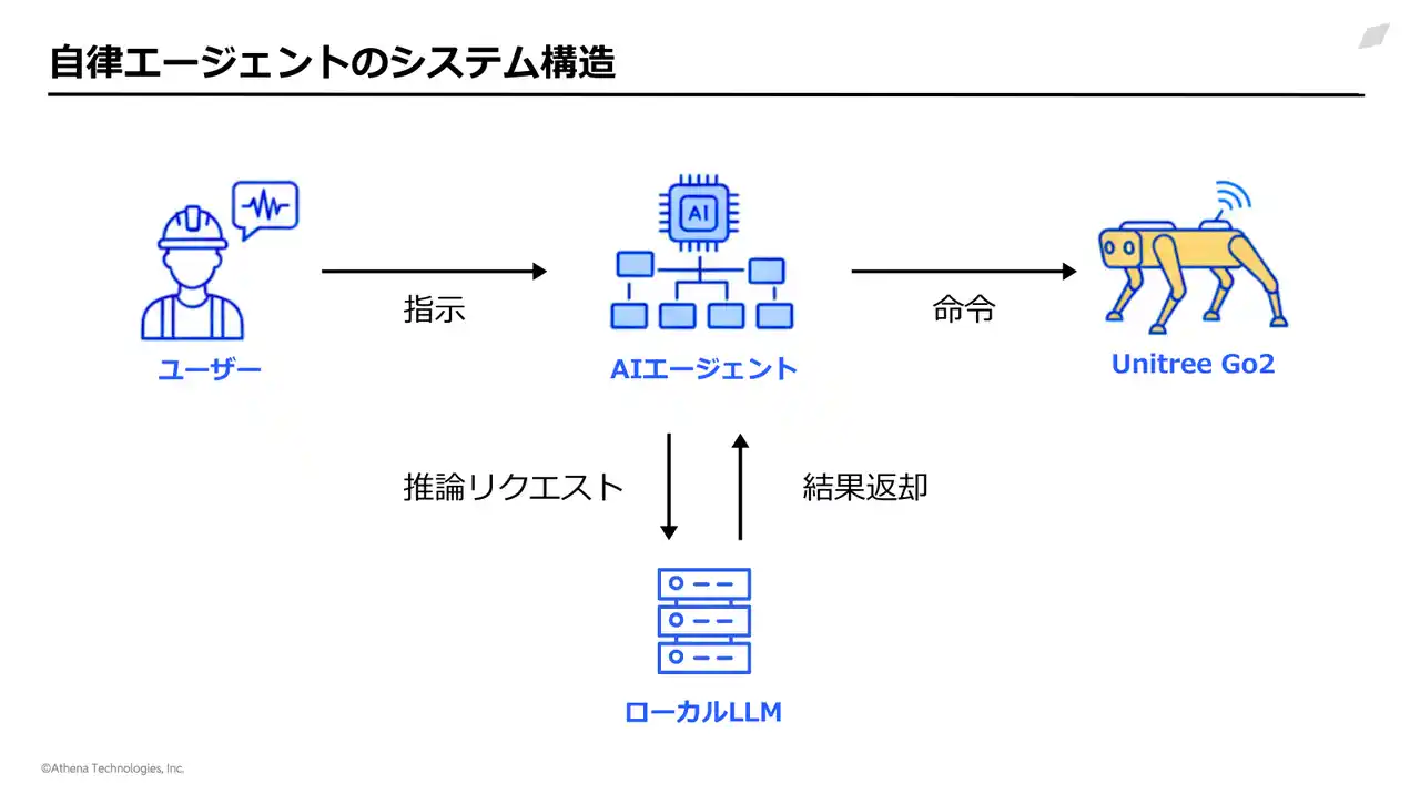現場作業員の発した音声指示は、まず閉域環境内の音声認識モデルによってテキスト化されます。その内容は、ローカルLLMへ送られ、AIエージェントが指示内容を解釈。AIがロボットを操作するための最適なコマンドを即座に生成することで、「声」による指示スタイルを実現します。 |