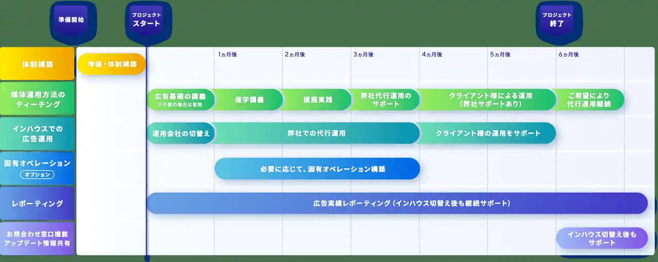 これまでの広告運用・マーケティング支援を通じて蓄積してきたノウハウを活かし、企業のマーケティング組織構築や人材育成、運用プロセスの整備などを支援することで、企業が持続的に成果を生み出せるマーケティング体制の構築を目指しています。 |