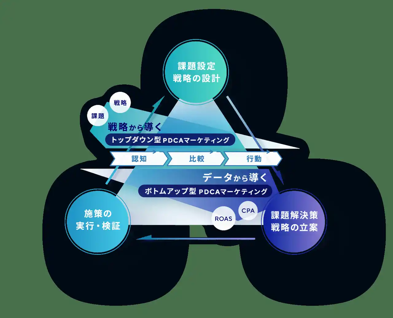 ダイレクト広告領域において単なる広告運用にとどまらず、戦略設計・ターゲット規定・クリエイティブ制作・広告運用までを上流からワンストップで支援することで、事業貢献最大化を目的変数としたPDCAマーケティングを実行しています。 |