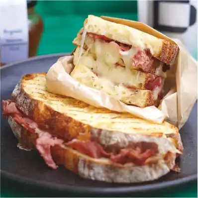 従来のお昼時に合わせて用意しているサンドイッチとは別に、購入後に店舗のパニーニクッカーでプレス焼きをしてからご提供いたします。B²自慢のカンパーニュに、様々な具材を挟んだサンドイッチは、パン生地の味わいもしっかり感じられるよう、挟む具材はなるべくシンプルに。いそがしいランチタイムでもクイックに楽しめる一品です。 |